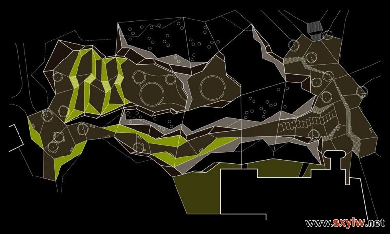 随着人们生活质量的提高,该地区的人们似乎越来越需要一个崭新的,宽阔的健身广场来满足他们的精神需求,可是,该区域目前已经几乎被各种各样的景观占满了,唯一的一片空旷地带就是一个草坪区,四周是几条通道和小径,位于Terme Olimia的中心位置。该设计团队希望此次的广场设计能够拥有很强的综合性和包容性,这样的话,在一些板块的建设上就需要一个大跨距的空间以及非常高大的室内空间。为了达到所期望的目标,设计团队手下的健身广场更多的像一个园林景观而不是一栋硬生生的大楼。该广场的外观呈折叠状,该结构效果是通过一系列的承重墙来实现的,这些承重墙将广场上的绿色区域分为不同层次,布局方面也做的很到位。因为在该项目中,健身广场并不打算设计成以往的健身大楼,所以空间格局的布置并没有限制在道路围成的区域内,可健身的地方遍布整个广场,只要视线能到的地方,一定会有健身设施的存在。